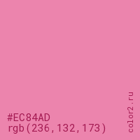 Цвет #EC84AD в цветовой модели RGB обозначается тремя октетами (236, 132, 173) в десятичном формате и #EC84AD в шестнадцатиричном (hex) формате, которые являются интенсивностью красного 236 (hex EC), интенсивность зелёного 132 (hex 84) и интенсивность синего 173 (hex AD).