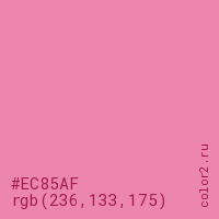 Цвет #EC85AF в цветовой модели RGB обозначается тремя октетами (236, 133, 175) в десятичном формате и #EC85AF в шестнадцатиричном (hex) формате, которые являются интенсивностью красного 236 (hex EC), интенсивность зелёного 133 (hex 85) и интенсивность синего 175 (hex AF).