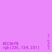 Цвет #EC86FB в цветовой модели RGB обозначается тремя октетами (236, 134, 251) в десятичном формате и #EC86FB в шестнадцатиричном (hex) формате, которые являются интенсивностью красного 236 (hex EC), интенсивность зелёного 134 (hex 86) и интенсивность синего 251 (hex FB).