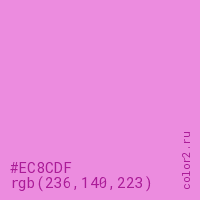 Цвет #EC8CDF в цветовой модели RGB обозначается тремя октетами (236, 140, 223) в десятичном формате и #EC8CDF в шестнадцатиричном (hex) формате, которые являются интенсивностью красного 236 (hex EC), интенсивность зелёного 140 (hex 8C) и интенсивность синего 223 (hex DF).
