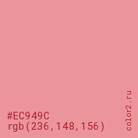 Цвет #EC949C в цветовой модели RGB обозначается тремя октетами (236, 148, 156) в десятичном формате и #EC949C в шестнадцатиричном (hex) формате, которые являются интенсивностью красного 236 (hex EC), интенсивность зелёного 148 (hex 94) и интенсивность синего 156 (hex 9C).