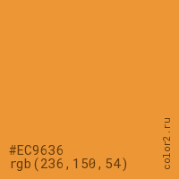 Цвет #EC9636 в цветовой модели RGB обозначается тремя октетами (236, 150, 54) в десятичном формате и #EC9636 в шестнадцатиричном (hex) формате, которые являются интенсивностью красного 236 (hex EC), интенсивность зелёного 150 (hex 96) и интенсивность синего 54 (hex 36).
