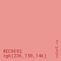 Цвет #EC9692 в цветовой модели RGB обозначается тремя октетами (236, 150, 146) в десятичном формате и #EC9692 в шестнадцатиричном (hex) формате, которые являются интенсивностью красного 236 (hex EC), интенсивность зелёного 150 (hex 96) и интенсивность синего 146 (hex 92).