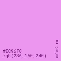 Цвет RGB(236, 150, 240) в процентом отношении количества цвета состоит из 92.5% красного (red), 58.8% зелёного (green) и 94.1% синего (blue).
