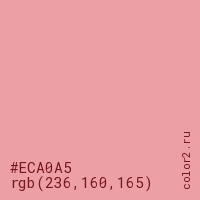 Цвет #ECA0A5 в цветовой модели RGB обозначается тремя октетами (236, 160, 165) в десятичном формате и #ECA0A5 в шестнадцатиричном (hex) формате, которые являются интенсивностью красного 236 (hex EC), интенсивность зелёного 160 (hex A0) и интенсивность синего 165 (hex A5).