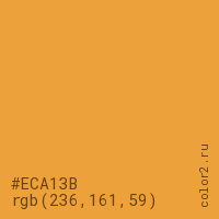 Цвет #ECA13B в цветовой модели RGB обозначается тремя октетами (236, 161, 59) в десятичном формате и #ECA13B в шестнадцатиричном (hex) формате, которые являются интенсивностью красного 236 (hex EC), интенсивность зелёного 161 (hex A1) и интенсивность синего 59 (hex 3B).