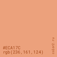 Цвет #ECA17C в цветовой модели RGB обозначается тремя октетами (236, 161, 124) в десятичном формате и #ECA17C в шестнадцатиричном (hex) формате, которые являются интенсивностью красного 236 (hex EC), интенсивность зелёного 161 (hex A1) и интенсивность синего 124 (hex 7C).