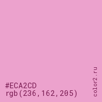 Цвет #ECA2CD в цветовой модели RGB обозначается тремя октетами (236, 162, 205) в десятичном формате и #ECA2CD в шестнадцатиричном (hex) формате, которые являются интенсивностью красного 236 (hex EC), интенсивность зелёного 162 (hex A2) и интенсивность синего 205 (hex CD).
