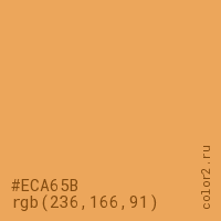Цвет #ECA65B в цветовой модели RGB обозначается тремя октетами (236, 166, 91) в десятичном формате и #ECA65B в шестнадцатиричном (hex) формате, которые являются интенсивностью красного 236 (hex EC), интенсивность зелёного 166 (hex A6) и интенсивность синего 91 (hex 5B).