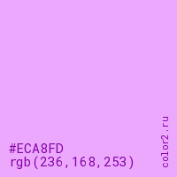 Цвет #ECA8FD в цветовой модели RGB обозначается тремя октетами (236, 168, 253) в десятичном формате и #ECA8FD в шестнадцатиричном (hex) формате, которые являются интенсивностью красного 236 (hex EC), интенсивность зелёного 168 (hex A8) и интенсивность синего 253 (hex FD).
