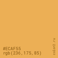 Цвет #ECAF55 в цветовой модели RGB обозначается тремя октетами (236, 175, 85) в десятичном формате и #ECAF55 в шестнадцатиричном (hex) формате, которые являются интенсивностью красного 236 (hex EC), интенсивность зелёного 175 (hex AF) и интенсивность синего 85 (hex 55).