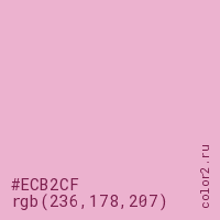 Цвет #ECB2CF в цветовой модели RGB обозначается тремя октетами (236, 178, 207) в десятичном формате и #ECB2CF в шестнадцатиричном (hex) формате, которые являются интенсивностью красного 236 (hex EC), интенсивность зелёного 178 (hex B2) и интенсивность синего 207 (hex CF).