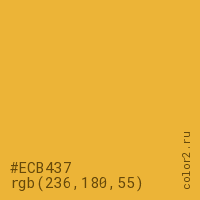 Цвет #ECB437 в цветовой модели RGB обозначается тремя октетами (236, 180, 55) в десятичном формате и #ECB437 в шестнадцатиричном (hex) формате, которые являются интенсивностью красного 236 (hex EC), интенсивность зелёного 180 (hex B4) и интенсивность синего 55 (hex 37).