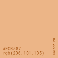 Цвет #ECB587 в цветовой модели RGB обозначается тремя октетами (236, 181, 135) в десятичном формате и #ECB587 в шестнадцатиричном (hex) формате, которые являются интенсивностью красного 236 (hex EC), интенсивность зелёного 181 (hex B5) и интенсивность синего 135 (hex 87).