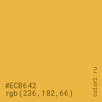 Цвет #ECB642 в цветовой модели RGB обозначается тремя октетами (236, 182, 66) в десятичном формате и #ECB642 в шестнадцатиричном (hex) формате, которые являются интенсивностью красного 236 (hex EC), интенсивность зелёного 182 (hex B6) и интенсивность синего 66 (hex 42).
