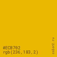 Цвет #ECB702 в цветовой модели RGB обозначается тремя октетами (236, 183, 2) в десятичном формате и #ECB702 в шестнадцатиричном (hex) формате, которые являются интенсивностью красного 236 (hex EC), интенсивность зелёного 183 (hex B7) и интенсивность синего 2 (hex 02).