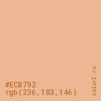 Цвет #ECB792 в цветовой модели RGB обозначается тремя октетами (236, 183, 146) в десятичном формате и #ECB792 в шестнадцатиричном (hex) формате, которые являются интенсивностью красного 236 (hex EC), интенсивность зелёного 183 (hex B7) и интенсивность синего 146 (hex 92).