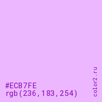 Цвет #ECB7FE в цветовой модели RGB обозначается тремя октетами (236, 183, 254) в десятичном формате и #ECB7FE в шестнадцатиричном (hex) формате, которые являются интенсивностью красного 236 (hex EC), интенсивность зелёного 183 (hex B7) и интенсивность синего 254 (hex FE).