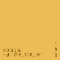 Цвет #ECBC56 в цветовой модели RGB обозначается тремя октетами (236, 188, 86) в десятичном формате и #ECBC56 в шестнадцатиричном (hex) формате, которые являются интенсивностью красного 236 (hex EC), интенсивность зелёного 188 (hex BC) и интенсивность синего 86 (hex 56).