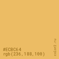 Цвет #ECBC64 в цветовой модели RGB обозначается тремя октетами (236, 188, 100) в десятичном формате и #ECBC64 в шестнадцатиричном (hex) формате, которые являются интенсивностью красного 236 (hex EC), интенсивность зелёного 188 (hex BC) и интенсивность синего 100 (hex 64).