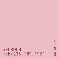 Цвет #ECBDC4 в цветовой модели RGB обозначается тремя октетами (236, 189, 196) в десятичном формате и #ECBDC4 в шестнадцатиричном (hex) формате, которые являются интенсивностью красного 236 (hex EC), интенсивность зелёного 189 (hex BD) и интенсивность синего 196 (hex C4).