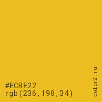 Цвет #ECBE22 в цветовой модели RGB обозначается тремя октетами (236, 190, 34) в десятичном формате и #ECBE22 в шестнадцатиричном (hex) формате, которые являются интенсивностью красного 236 (hex EC), интенсивность зелёного 190 (hex BE) и интенсивность синего 34 (hex 22).
