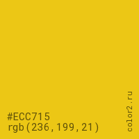 Цвет #ECC715 в цветовой модели RGB обозначается тремя октетами (236, 199, 21) в десятичном формате и #ECC715 в шестнадцатиричном (hex) формате, которые являются интенсивностью красного 236 (hex EC), интенсивность зелёного 199 (hex C7) и интенсивность синего 21 (hex 15).