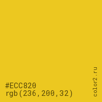 Цвет #ECC820 в цветовой модели RGB обозначается тремя октетами (236, 200, 32) в десятичном формате и #ECC820 в шестнадцатиричном (hex) формате, которые являются интенсивностью красного 236 (hex EC), интенсивность зелёного 200 (hex C8) и интенсивность синего 32 (hex 20).