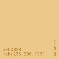 Цвет #ECC88B в цветовой модели RGB обозначается тремя октетами (236, 200, 139) в десятичном формате и #ECC88B в шестнадцатиричном (hex) формате, которые являются интенсивностью красного 236 (hex EC), интенсивность зелёного 200 (hex C8) и интенсивность синего 139 (hex 8B).
