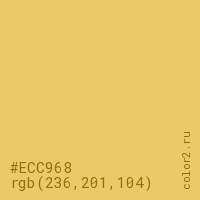 Цвет #ECC968 в цветовой модели RGB обозначается тремя октетами (236, 201, 104) в десятичном формате и #ECC968 в шестнадцатиричном (hex) формате, которые являются интенсивностью красного 236 (hex EC), интенсивность зелёного 201 (hex C9) и интенсивность синего 104 (hex 68).