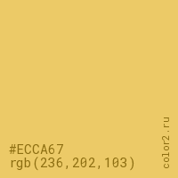 Цвет #ECCA67 в цветовой модели RGB обозначается тремя октетами (236, 202, 103) в десятичном формате и #ECCA67 в шестнадцатиричном (hex) формате, которые являются интенсивностью красного 236 (hex EC), интенсивность зелёного 202 (hex CA) и интенсивность синего 103 (hex 67).