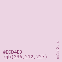 Цвет #ECD4E3 в цветовой модели RGB обозначается тремя октетами (236, 212, 227) в десятичном формате и #ECD4E3 в шестнадцатиричном (hex) формате, которые являются интенсивностью красного 236 (hex EC), интенсивность зелёного 212 (hex D4) и интенсивность синего 227 (hex E3).