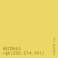 Цвет #ECD665 в цветовой модели RGB обозначается тремя октетами (236, 214, 101) в десятичном формате и #ECD665 в шестнадцатиричном (hex) формате, которые являются интенсивностью красного 236 (hex EC), интенсивность зелёного 214 (hex D6) и интенсивность синего 101 (hex 65).
