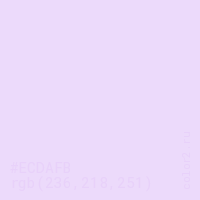 Цвет #ECDAFB в цветовой модели RGB обозначается тремя октетами (236, 218, 251) в десятичном формате и #ECDAFB в шестнадцатиричном (hex) формате, которые являются интенсивностью красного 236 (hex EC), интенсивность зелёного 218 (hex DA) и интенсивность синего 251 (hex FB).