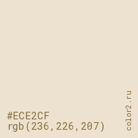 Цвет #ECE2CF в цветовой модели RGB обозначается тремя октетами (236, 226, 207) в десятичном формате и #ECE2CF в шестнадцатиричном (hex) формате, которые являются интенсивностью красного 236 (hex EC), интенсивность зелёного 226 (hex E2) и интенсивность синего 207 (hex CF).
