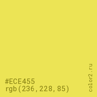 Цвет #ECE455 в цветовой модели RGB обозначается тремя октетами (236, 228, 85) в десятичном формате и #ECE455 в шестнадцатиричном (hex) формате, которые являются интенсивностью красного 236 (hex EC), интенсивность зелёного 228 (hex E4) и интенсивность синего 85 (hex 55).