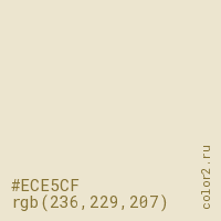 Цвет #ECE5CF в цветовой модели RGB обозначается тремя октетами (236, 229, 207) в десятичном формате и #ECE5CF в шестнадцатиричном (hex) формате, которые являются интенсивностью красного 236 (hex EC), интенсивность зелёного 229 (hex E5) и интенсивность синего 207 (hex CF).