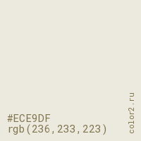 Цвет #ECE9DF в цветовой модели RGB обозначается тремя октетами (236, 233, 223) в десятичном формате и #ECE9DF в шестнадцатиричном (hex) формате, которые являются интенсивностью красного 236 (hex EC), интенсивность зелёного 233 (hex E9) и интенсивность синего 223 (hex DF).