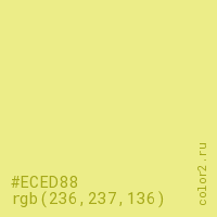 Цвет RGB(236, 237, 136) в процентом отношении количества цвета состоит из 92.5% красного (red), 92.9% зелёного (green) и 53.3% синего (blue).