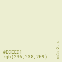 Цвет #ECEED1 в цветовой модели RGB обозначается тремя октетами (236, 238, 209) в десятичном формате и #ECEED1 в шестнадцатиричном (hex) формате, которые являются интенсивностью красного 236 (hex EC), интенсивность зелёного 238 (hex EE) и интенсивность синего 209 (hex D1).