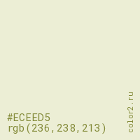 Цвет #ECEED5 в цветовой модели RGB обозначается тремя октетами (236, 238, 213) в десятичном формате и #ECEED5 в шестнадцатиричном (hex) формате, которые являются интенсивностью красного 236 (hex EC), интенсивность зелёного 238 (hex EE) и интенсивность синего 213 (hex D5).