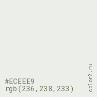 Цвет #ECEEE9 в цветовой модели RGB обозначается тремя октетами (236, 238, 233) в десятичном формате и #ECEEE9 в шестнадцатиричном (hex) формате, которые являются интенсивностью красного 236 (hex EC), интенсивность зелёного 238 (hex EE) и интенсивность синего 233 (hex E9).