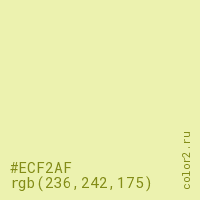 Цвет #ECF2AF в цветовой модели RGB обозначается тремя октетами (236, 242, 175) в десятичном формате и #ECF2AF в шестнадцатиричном (hex) формате, которые являются интенсивностью красного 236 (hex EC), интенсивность зелёного 242 (hex F2) и интенсивность синего 175 (hex AF).