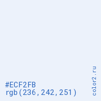 Цвет #ECF2FB в цветовой модели RGB обозначается тремя октетами (236, 242, 251) в десятичном формате и #ECF2FB в шестнадцатиричном (hex) формате, которые являются интенсивностью красного 236 (hex EC), интенсивность зелёного 242 (hex F2) и интенсивность синего 251 (hex FB).