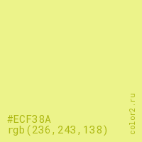 Цвет #ECF38A в цветовой модели RGB обозначается тремя октетами (236, 243, 138) в десятичном формате и #ECF38A в шестнадцатиричном (hex) формате, которые являются интенсивностью красного 236 (hex EC), интенсивность зелёного 243 (hex F3) и интенсивность синего 138 (hex 8A).
