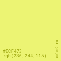 Цвет #ECF473 в цветовой модели RGB обозначается тремя октетами (236, 244, 115) в десятичном формате и #ECF473 в шестнадцатиричном (hex) формате, которые являются интенсивностью красного 236 (hex EC), интенсивность зелёного 244 (hex F4) и интенсивность синего 115 (hex 73).