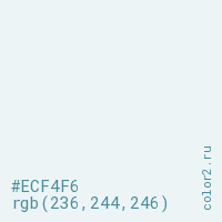 Цвет #ECF4F6 в цветовой модели RGB обозначается тремя октетами (236, 244, 246) в десятичном формате и #ECF4F6 в шестнадцатиричном (hex) формате, которые являются интенсивностью красного 236 (hex EC), интенсивность зелёного 244 (hex F4) и интенсивность синего 246 (hex F6).
