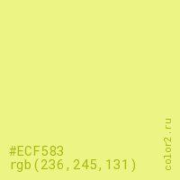 Цвет #ECF583 в цветовой модели RGB обозначается тремя октетами (236, 245, 131) в десятичном формате и #ECF583 в шестнадцатиричном (hex) формате, которые являются интенсивностью красного 236 (hex EC), интенсивность зелёного 245 (hex F5) и интенсивность синего 131 (hex 83).