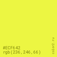 Цвет #ECF642 в цветовой модели RGB обозначается тремя октетами (236, 246, 66) в десятичном формате и #ECF642 в шестнадцатиричном (hex) формате, которые являются интенсивностью красного 236 (hex EC), интенсивность зелёного 246 (hex F6) и интенсивность синего 66 (hex 42).