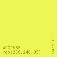 Цвет #ECF655 в цветовой модели RGB обозначается тремя октетами (236, 246, 85) в десятичном формате и #ECF655 в шестнадцатиричном (hex) формате, которые являются интенсивностью красного 236 (hex EC), интенсивность зелёного 246 (hex F6) и интенсивность синего 85 (hex 55).